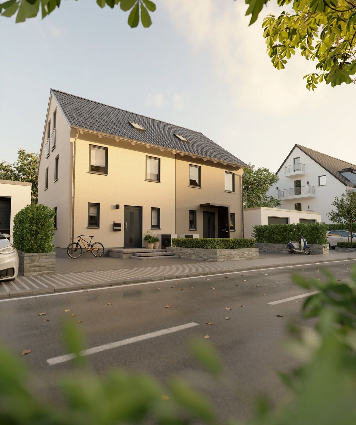 Das Zweifamilienhaus funktioniert nach dem gleichen Prinzip, bietet aber sofort zwei Familien unabhängig voneinander Wohnraum. Sie leben Wand an Wand, sind sich also nahe. Dennoch ist mit unabhängigen Eingängen, eigenen Küchen und sanitären Räumen sowie dem jeweils (optional) eigenen Garten Selbständigkeit möglich.