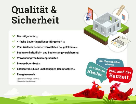 - Qualität und Sicherheit während der Bauzeit: 6 Monate Bauzeitgarantie, vierfache Baufertigstellugnsbürgschaft, von Wirtschaftsprüfern verwaltetes Baugeldkonto, Bauherrenhaftpflichtversicherung, Bauleistungsversicherung, Blower-Door-Test, Endkontrolle durch einen unabhängigen Baugutachter, Energieausweis